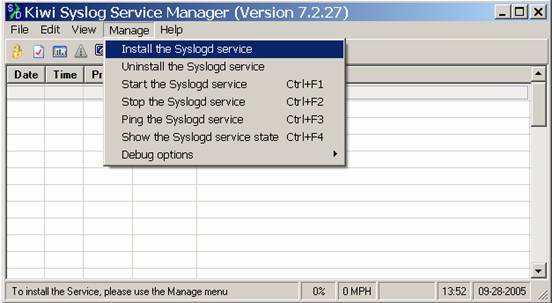 The first thing youll want to do is to install Kiwi as a Service, so that it starts up when your computer does. Obviously, you need to keep this computer turned on 24/7, or you will miss log data. To do this, click on Manage, then Install the Syslogd Service.