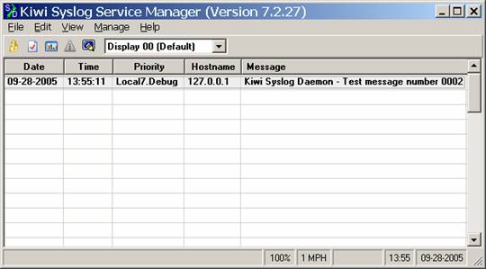Then click on the option to Start the Syslogd service, and then go to File, Send Message to Localhost to test that your service is running. If it is correctly running, you will see a test message such as the following appear on the screen:
