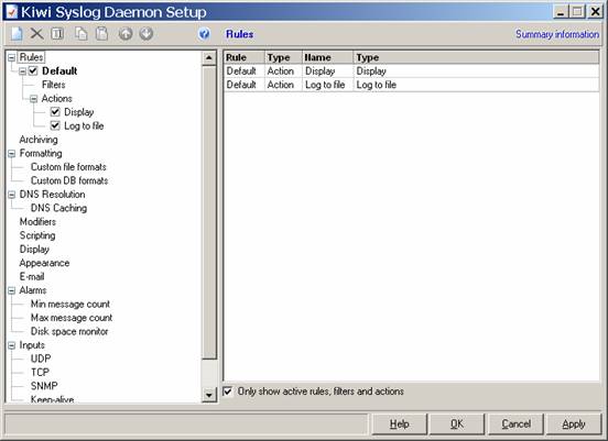 Next, go to http://www.kiwisyslog.com/ and download the latest version of the Kiwi Syslog Daemon. For our purposes, you can get by with the free version but I strongly encourage you to plunk down the cash for the registered version. Its just shy of $100 for a single license, and this is a good deal. You should support the author for his hard work, plus you get some spiffy features such as the ability to log data to a SQL database for later mining, forward events to e-mail, etc.