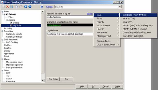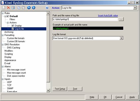 In any event, we want all of our data to go to c:\data\pixlogs, so we will modify the Kiwi configuration. Go to File, Setup, and you should see the behavior of the default filter right away: