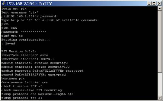 First, we connect to the PIXs inside IP address, and type in our password. When using SSH, the username is PIX, and the password is whatever you have configured: