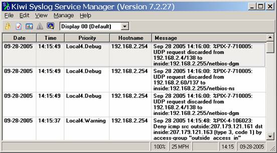 As soon as you type these items, your PIX should start sending information to your Kiwi syslog daemon. Since one of the default Kiwi rules is to display everything it receives, you should immediately see data on the Kiwi console such as the following: