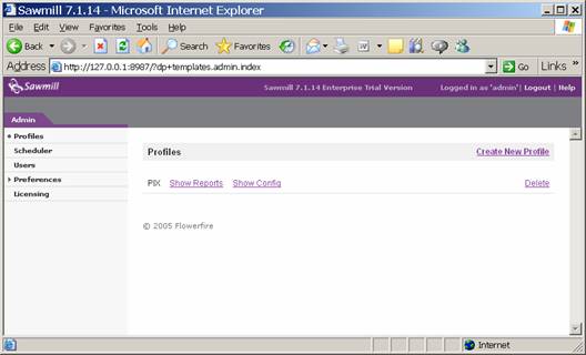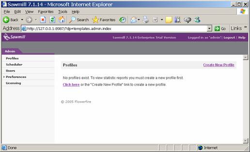 Install Sawmill as per the instructions. The default selections should be fine. Create a username and password that you will use to log into the Sawmill service. By default, Sawmill runs over HTTP on its own web server running on port 8987, so youll be accessing the administrative interface using a URL such as http://127.0.0.1:8987. When you have this set up, youll be faced with an empty Sawmill config.
