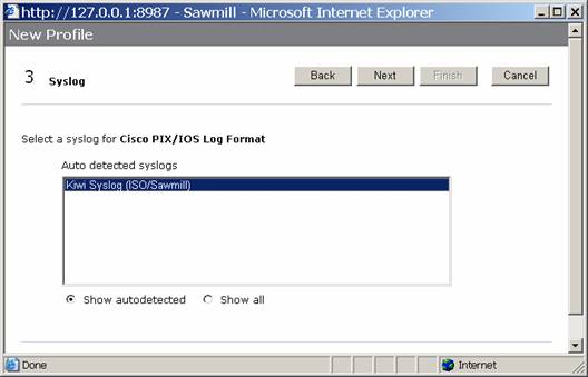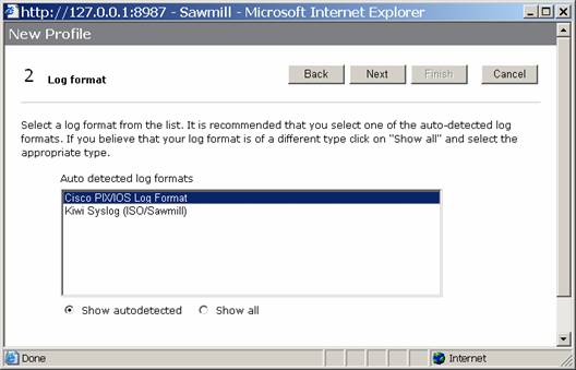 Click the Next button. Sawmill should discover your log files, and do some autodetection. Select the Cisco PIX/IOS Log Format option, and click Next.