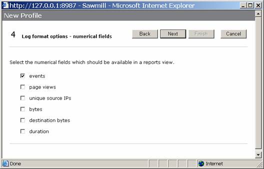 Select the options you want to track. These are indexes and so on that Sawmill will track. Presumably, the more you select, the bigger your database will get and the longer it will take. For our purposes, we will take the default, though you may wish to experiment: