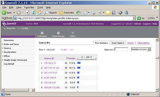If all went according to plan, you saw the system do some imports, and then ended up with your report. You can page through it and look at what it has to tell you, such as source IP addresses: