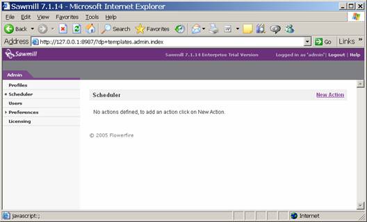 First, click on the Admin link in the top right of your screen, and select scheduler. Click on New Action