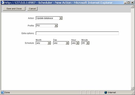 Select Update Database as your Action, and select the PIX as your data source. Next, tell configure the schedule section to be Any, Any, Any, 05. This means that on any month, on any day, on any hour, at 5 minutes past the hour, run this routine. Then do a save and close. Your screen should look like this: