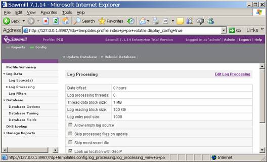You should now see the configuration of your PIX profile. Click on Log Data and then Log Processing and you will see a screen such as this: