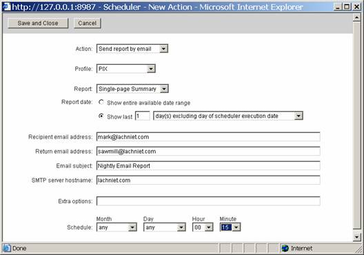 First, select Send Report by Email for the action, then select PIX as your profile. Select the type of report you want, notably the Single Page Summary and tell it to select data for the last 1 days, excluding the current day. Now, select your email settings. Make sure that the machine can actually communicate with your SMTP relay, and that the SMTP relay will accept the email! Configure the job to run on Any, Any, 00, 15. This will tell the job to run every month, on every date, at 12:15am. Hopefully this will give Sawmill enough time to process the last hours worth of logs before it fires up, but if you have a lot of log data, you might want to push this to 30 minutes after the hour or more. Your final screen should look like this: